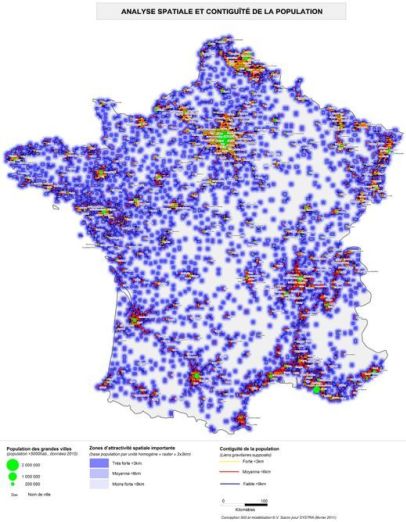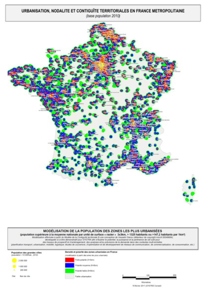 France polycentrique et urbaine (base INSEE population 2010). Modèle de Contiguïté territoriale© 2010. Travail 'pro-Bono' réalisé chez Systra.